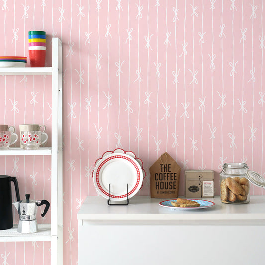 はがせる壁紙 のりなしタイプ What's poppin? リボンストライプ ナチュラル (49cm×2.5mサイズ) ローズ