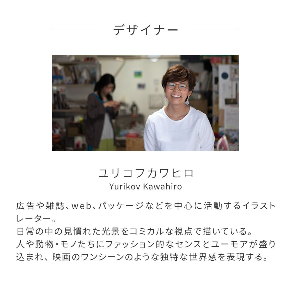 日常の中の見慣れた光景をコミカルな視点で描いている。人や動物・モノたちにファッション的なセンスとユーモアが盛り込まれ、 映画のワンシーンのような独特な世界感を表現する。