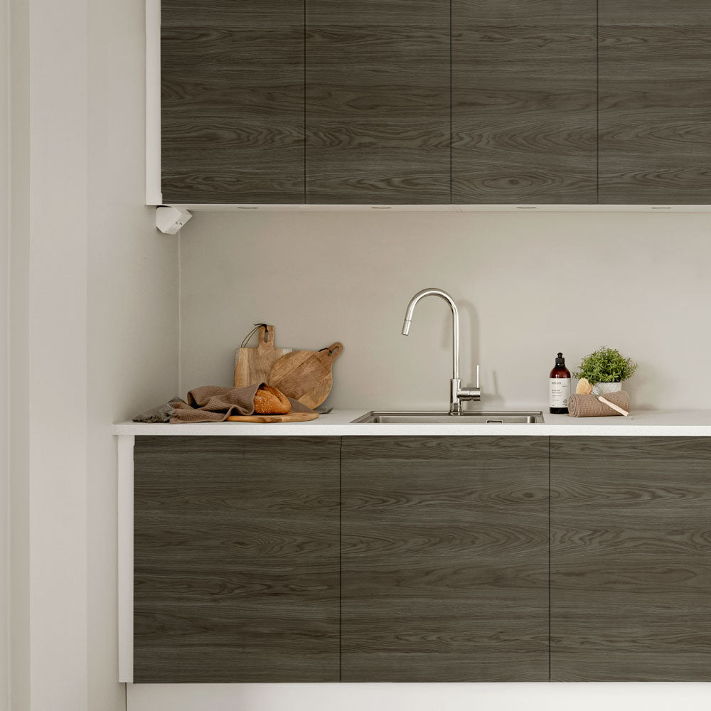 キッチンキャビネットやドアの色が家具の木目の色となんだか合わない。そんなときのおすすめの木目デザインのリメイクシート。