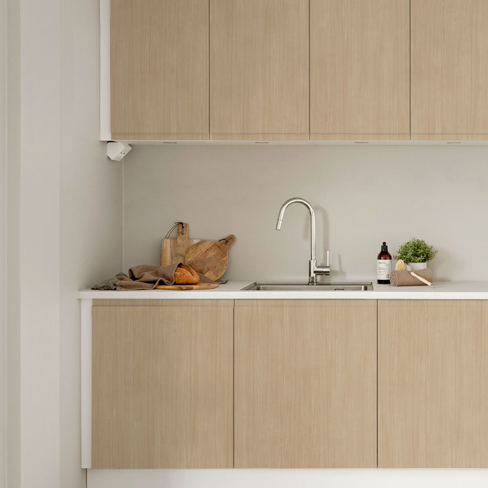 キッチンキャビネットやドアの色が家具の木目の色となんだか合わない。そんなときのおすすめの木目デザインのリメイクシート。