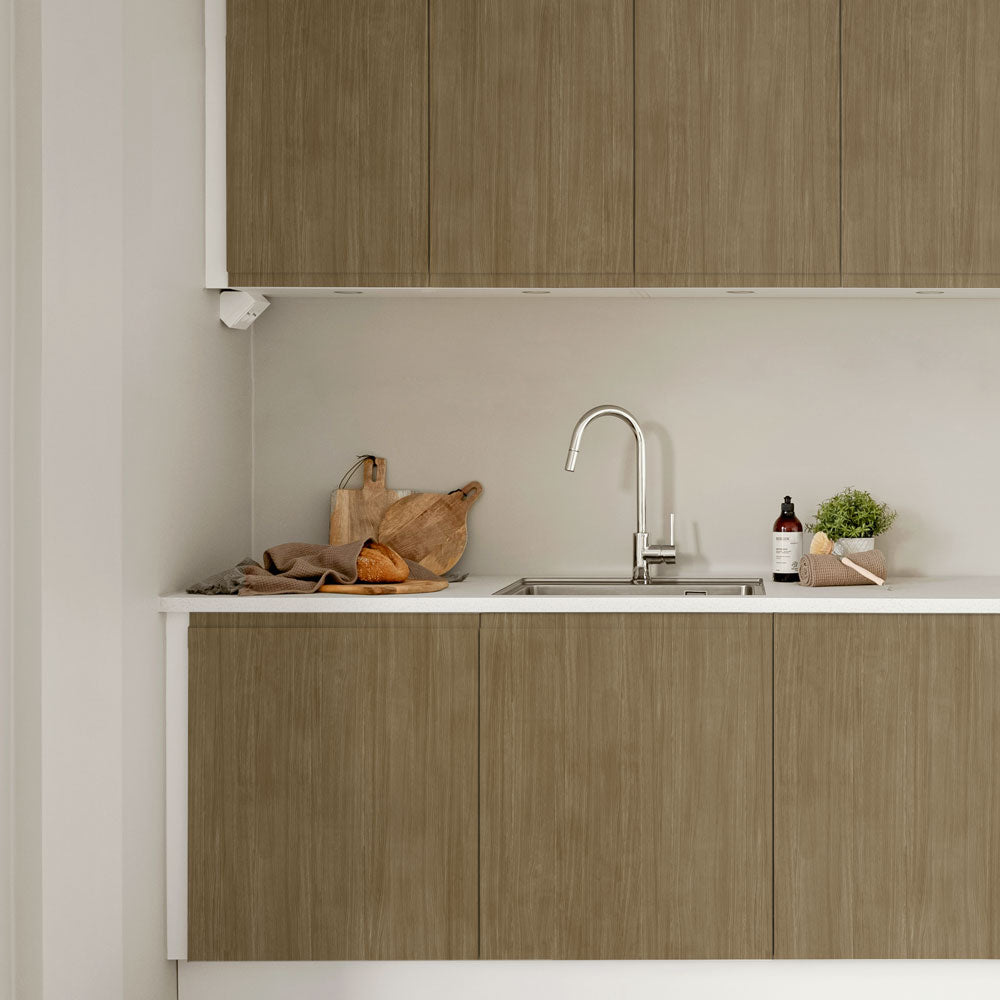 キッチンキャビネットやドアの色が家具の木目の色となんだか合わない。そんなときのおすすめの木目デザインのリメイクシート。