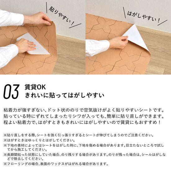 - クッションフロアなど塩ビ系素材の上に施工される際や、長期間貼った状態にしていた場合、下地にのり残りすることがあります。はがした際にのりが付着している場合は、水で薄めた中性洗剤やシール剥がしで拭き取ってください。