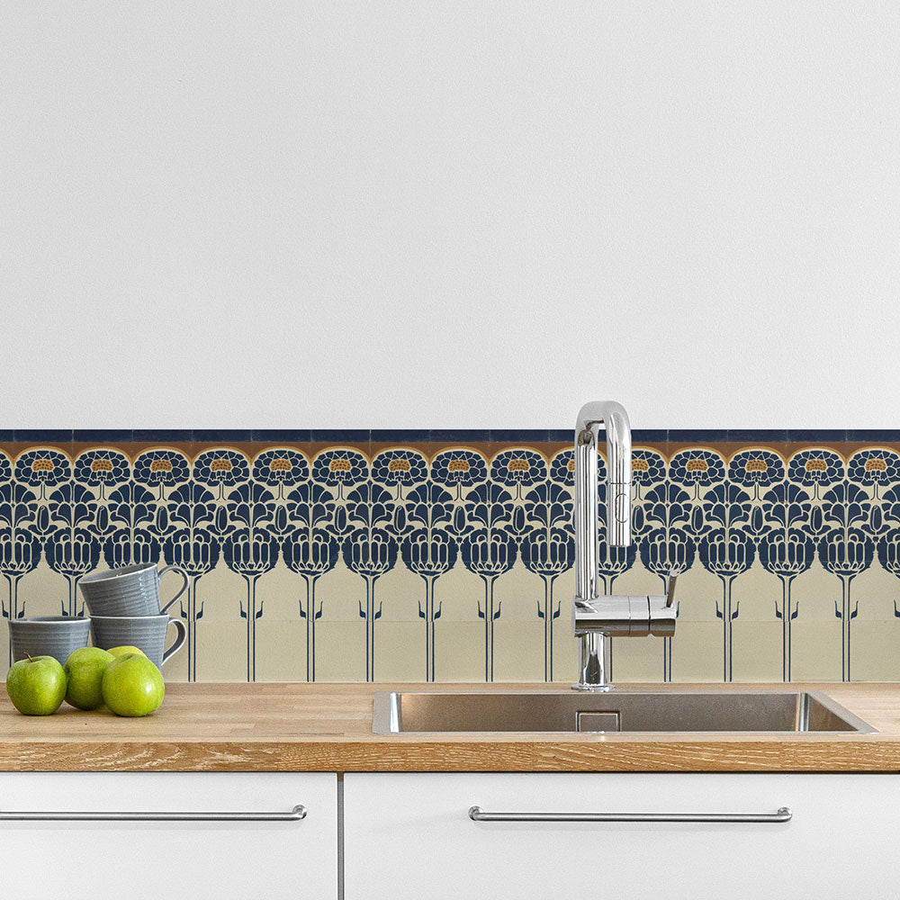 水はね防止シート アールヌーボータイル アズール MBS-VT01(25cm×1.3m)貼ってはがせる Hatte me! (ハッテミー) 横長サイズ