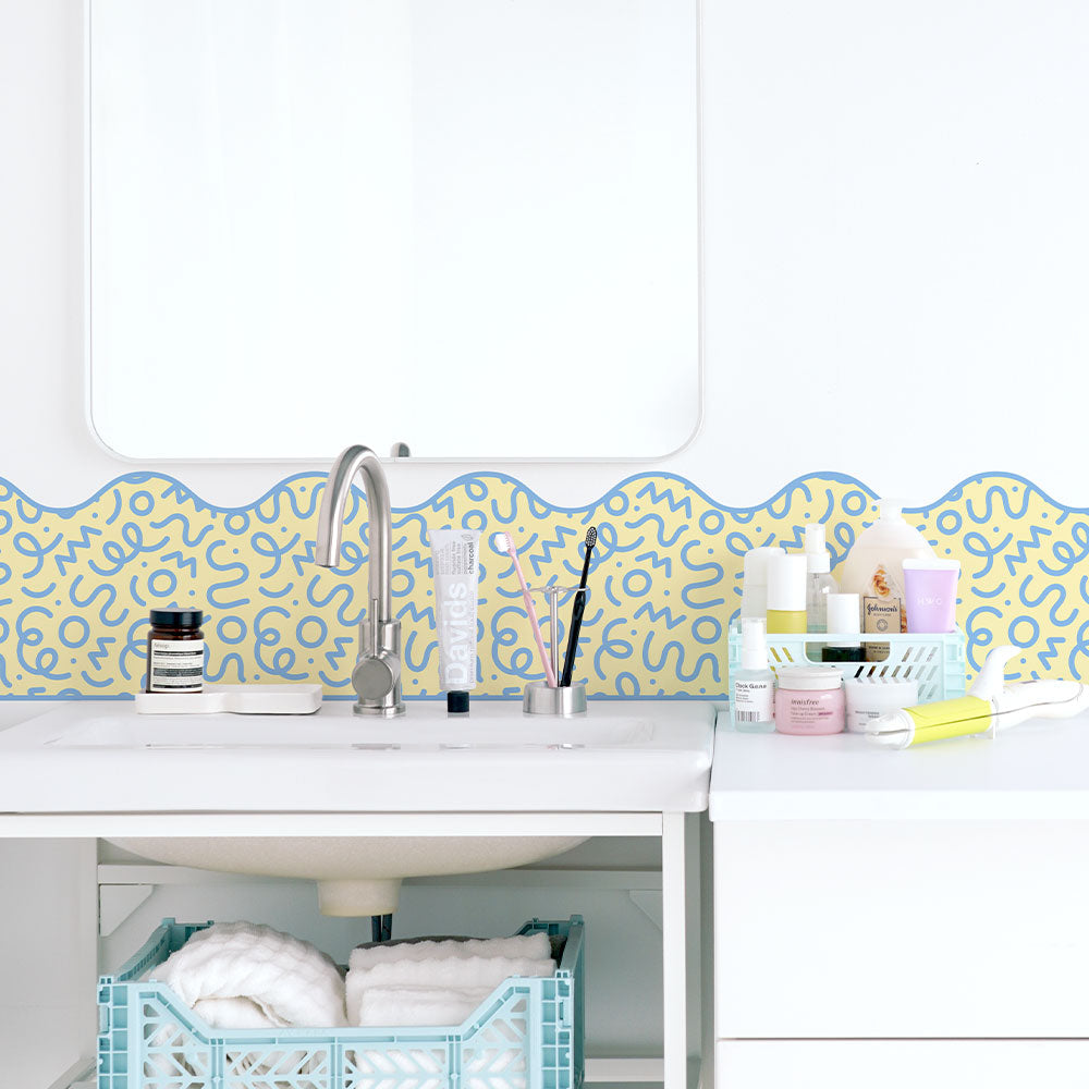水はね防止シート What's poppin? WIGGLE WAVE スカイ×イエロー MBS-WP09(25cm×1.3m)貼ってはがせる Hatte me! (ハッテミー) 横長サイズ