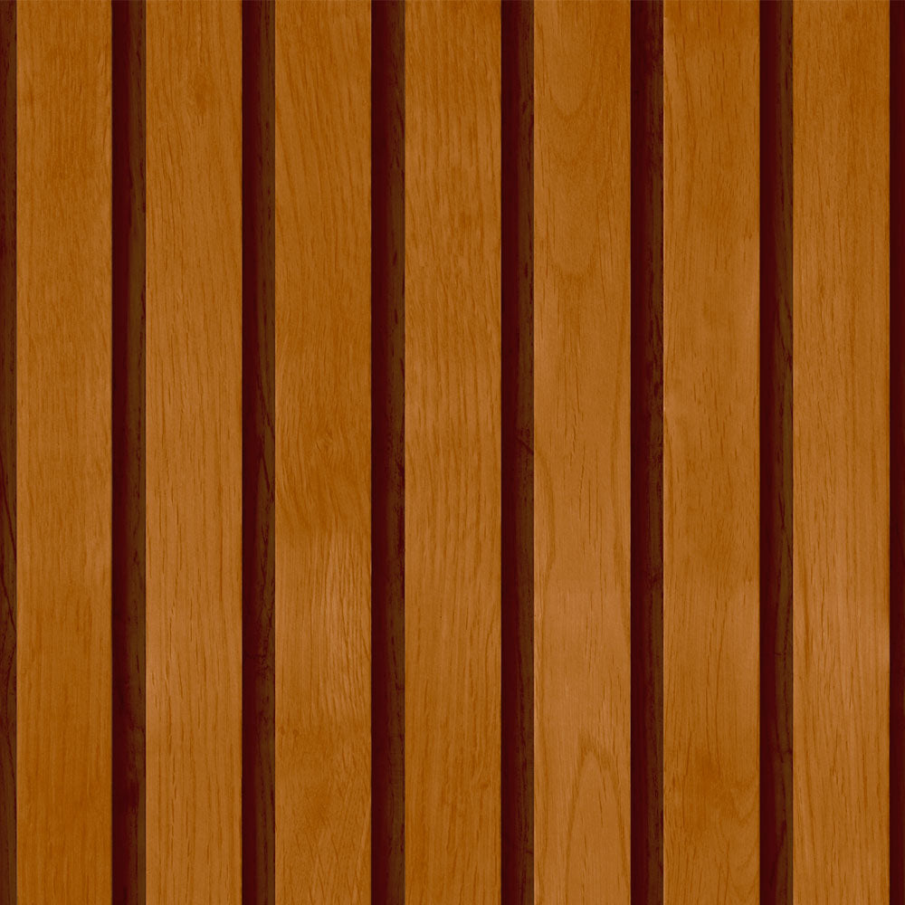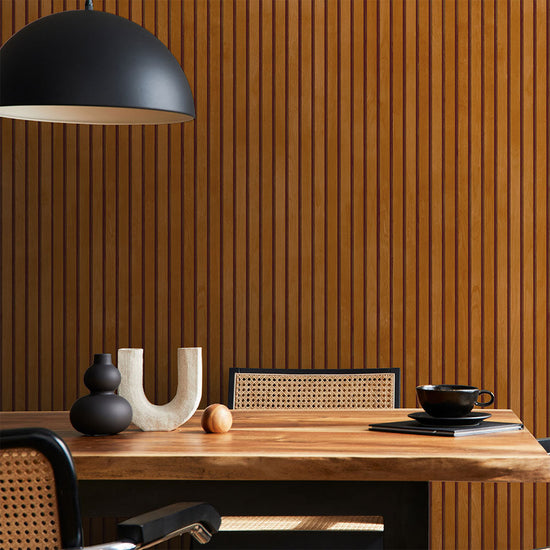ミッドセンチュリーインテリアをイメージしたこっくりしたブラウンのスラットウッドデザイン。