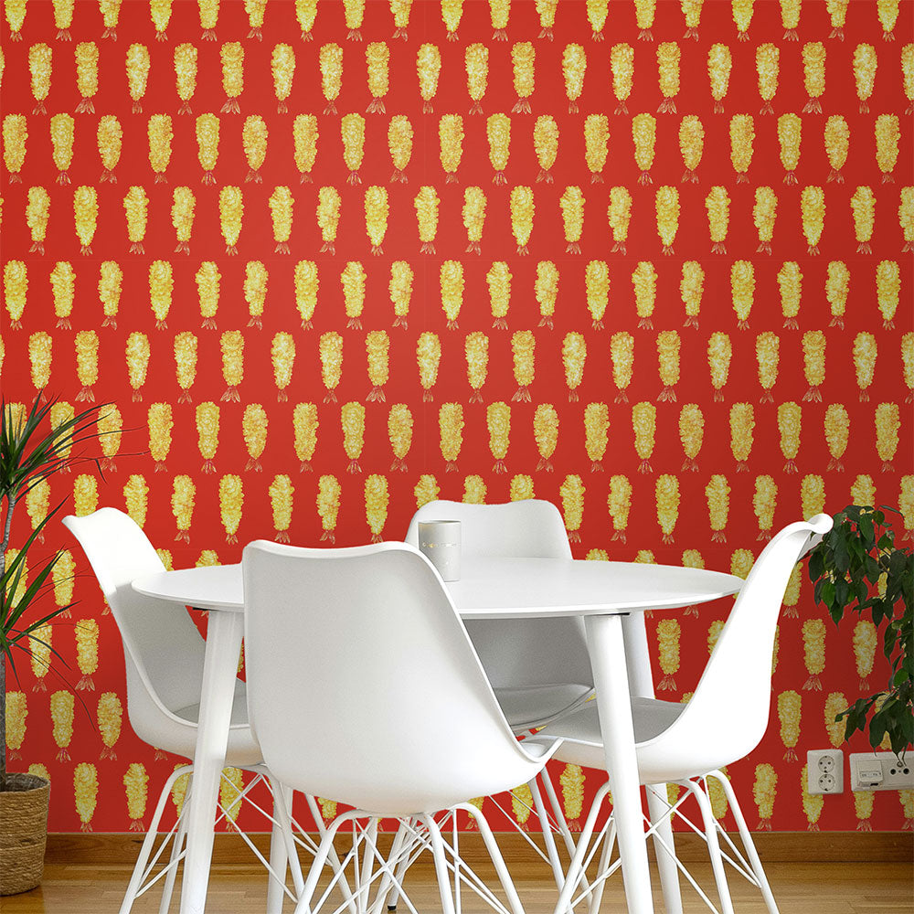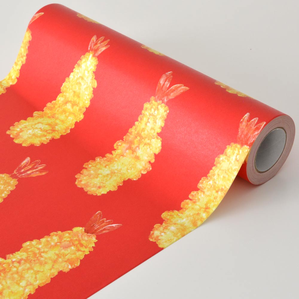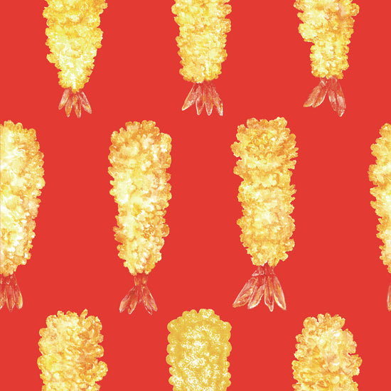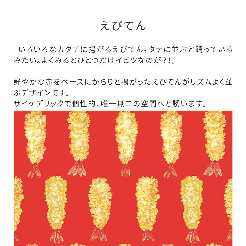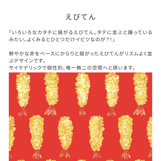 鮮やかな赤をベースにからりと揚がったえびてんがリズムよく並ぶデザインです。