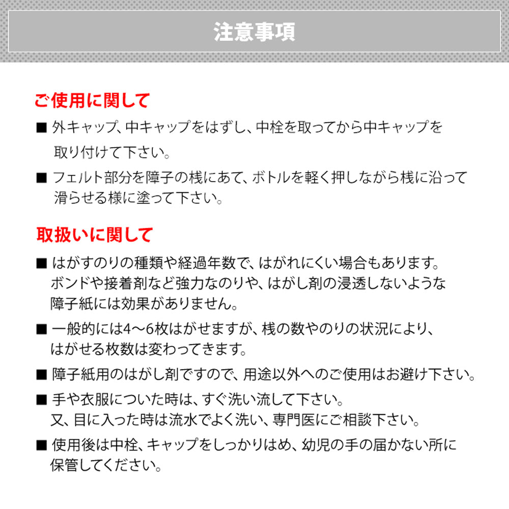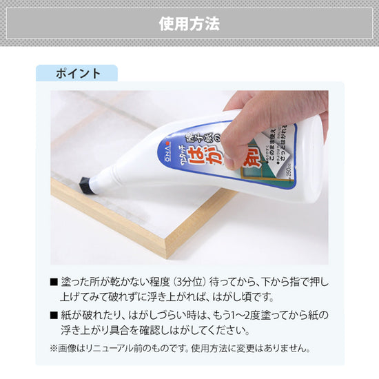 - はがすのりの種類や経過年数で、はがれにくい場合もあります。ボンドや接着剤など強力なのりや、はがし剤の浸透しないような障子紙には効果がありません。