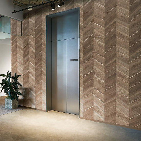 グレイッシュカラーのヘリンボーン。白太のラインと濃淡であらわれるストライプが、空間のアクセントに。