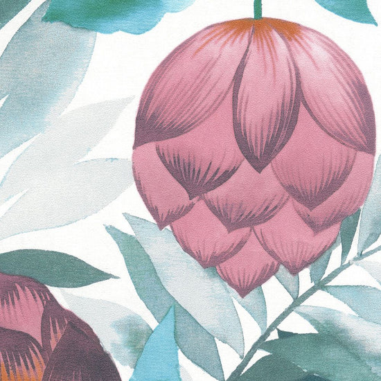 絵画のようなタッチと鮮やかな発色が目を引く、生命力あふれる大ぶりの植物柄です。