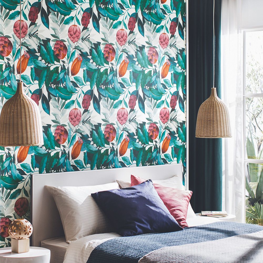 絵画のようなタッチと鮮やかな発色が目を引く、生命力あふれる大ぶりの植物柄です。