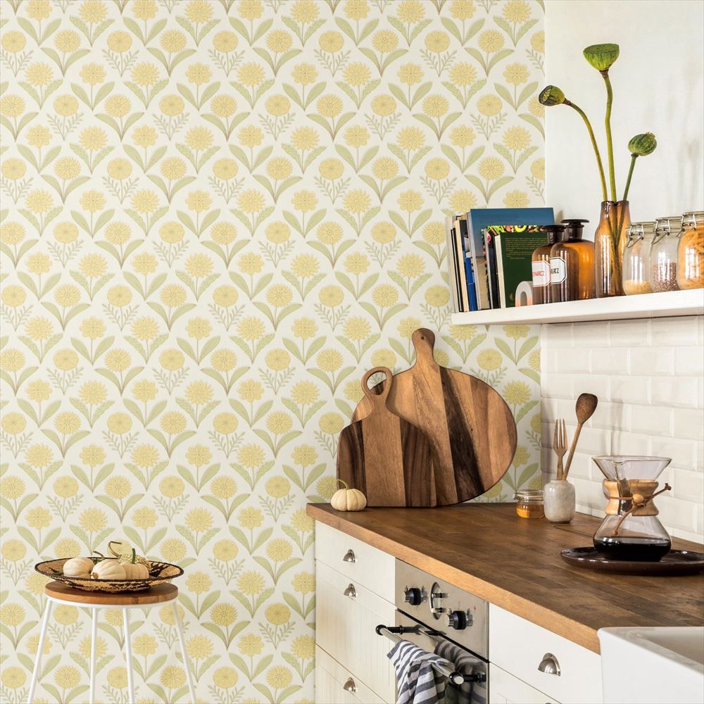 タンポポのようなイエローの花が並ぶノスタルジックな印象の壁紙です。ナチュラルスタイルや北欧スタイル、カフェスタイルにおすすめです。