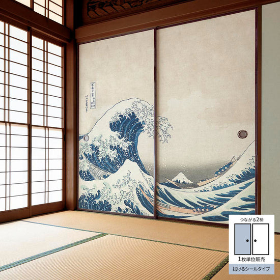 ふすまリメイクシート 拭けるシールタイプ つながる2柄 葛飾北斎 神奈川沖浪裏 A (約185cm×100cm)