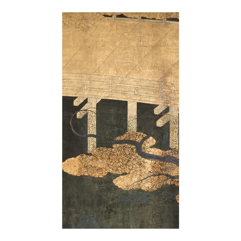 「柳橋水車図屏風(やなぎばし すいしゃず びょうぶ)」は、柳橋という場所に架かる橋と、その周りにある水車を描いた作品で自然の静けさと調和を感じさせる美しい構図が際立っています。
