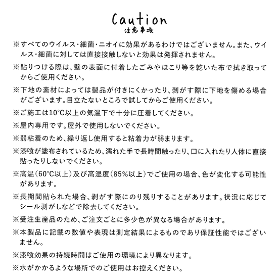 ・貼りつける際は、壁の表面に付着したごみやほこり等を乾いた布で拭き取ってからご使用ください。
