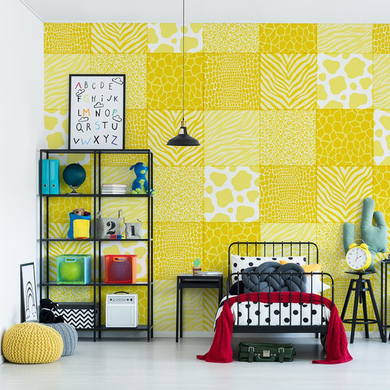 パッチワークのようにいろんな柄を並べて貼れる壁紙。