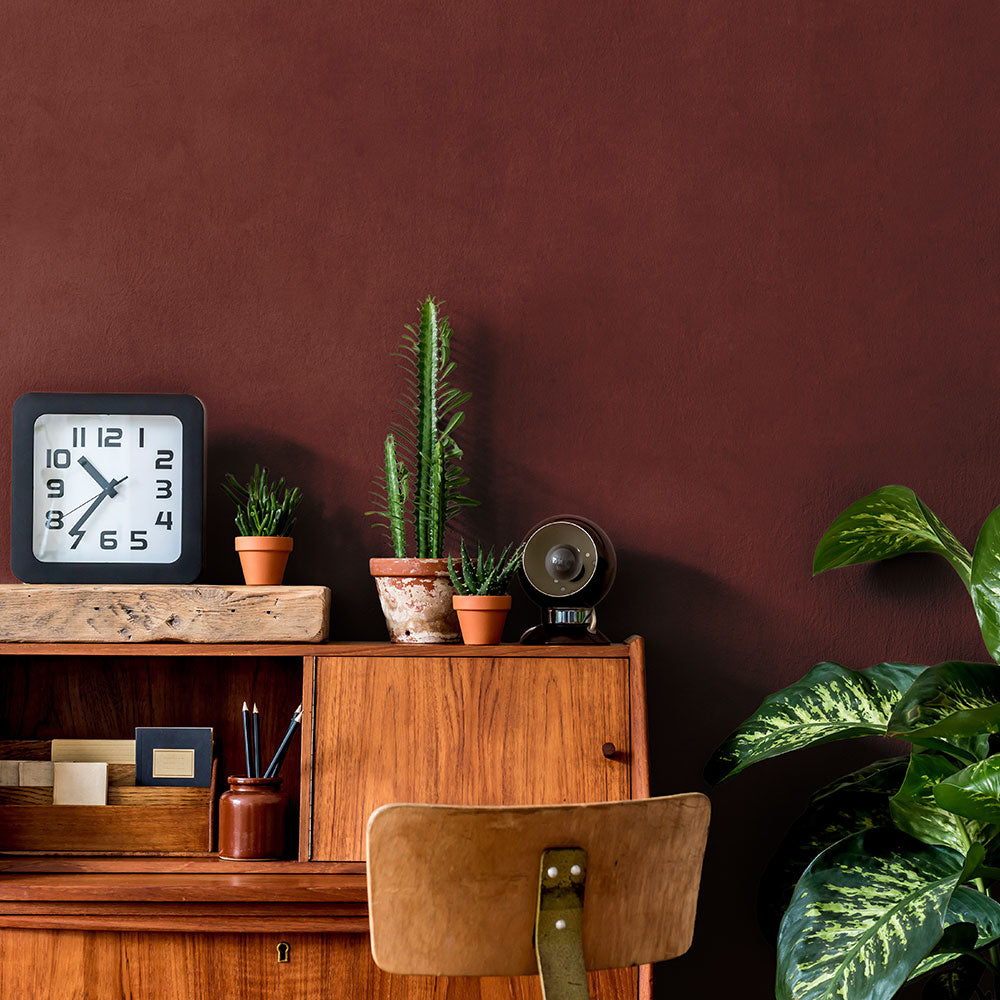 ざっくりとした塗り壁風のデザインに海外インテリアみたいな深みのあるカラーを載せました。