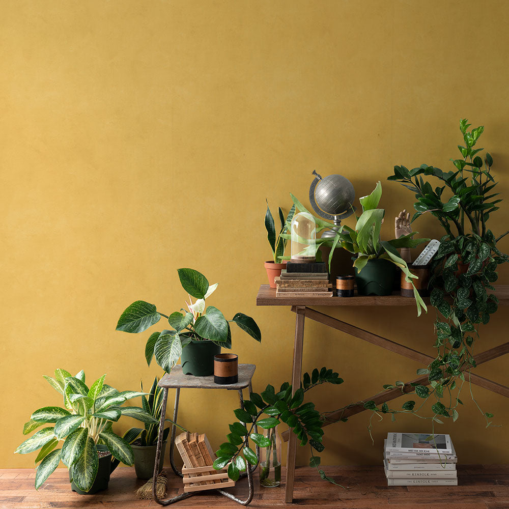 ざっくりとした塗り壁風のデザインに海外インテリアみたいなアースカラーを載せました。