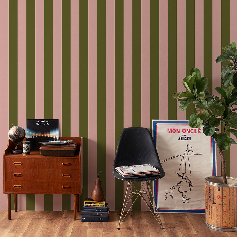 はがせる壁紙 のりなしタイプ ロンドンストライプW3 (49cm×2.5mサイズ) NKH-LS308 モスグリーン×ピンク