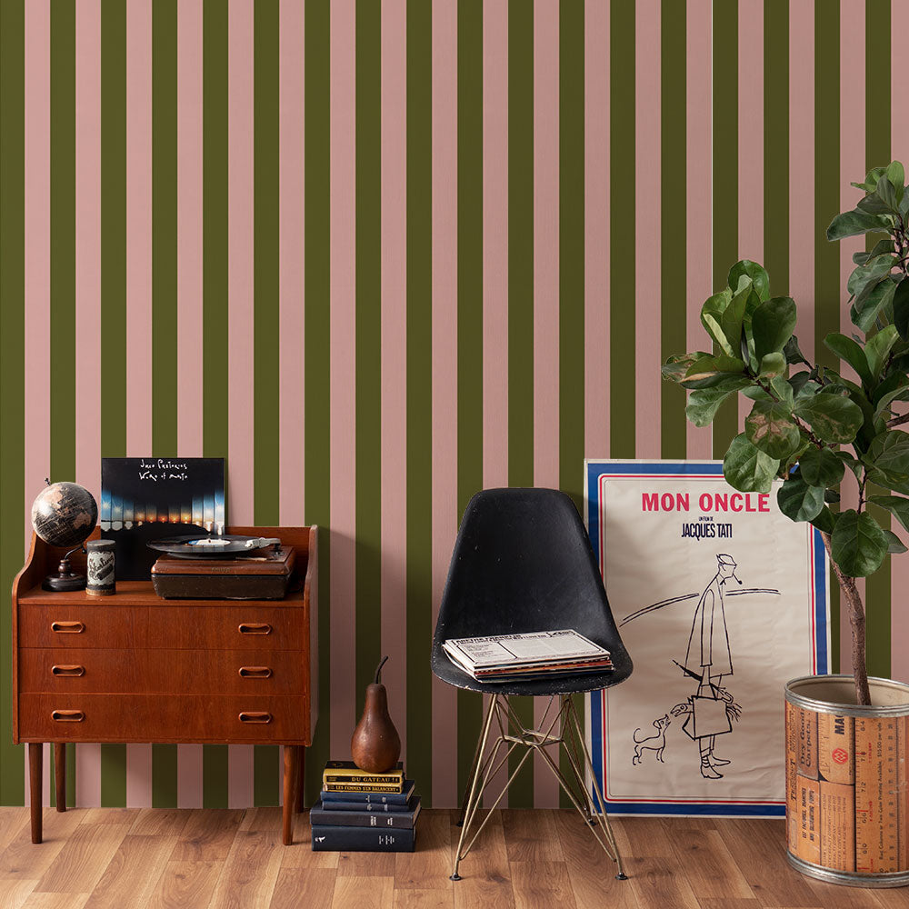 はがせる壁紙 のりなしタイプ ロンドンストライプW4 (49cm×2.5mサイズ) NKH-LS408 モスグリーン×ピンク