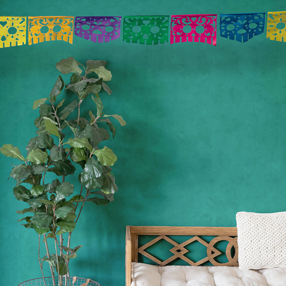 ざっくりとした塗り壁風のデザインにメキシコの鮮やかなインテリアをイメージしたカラーを載せました。