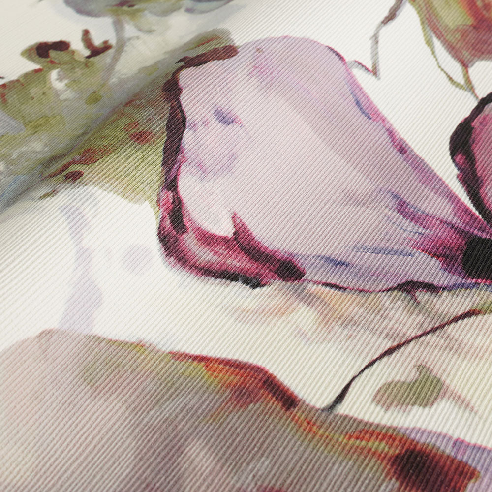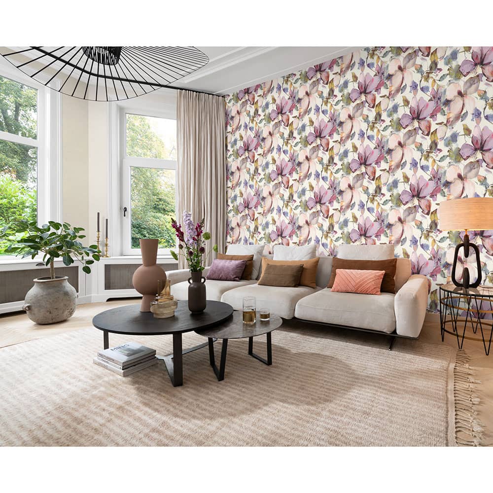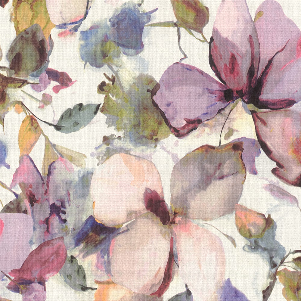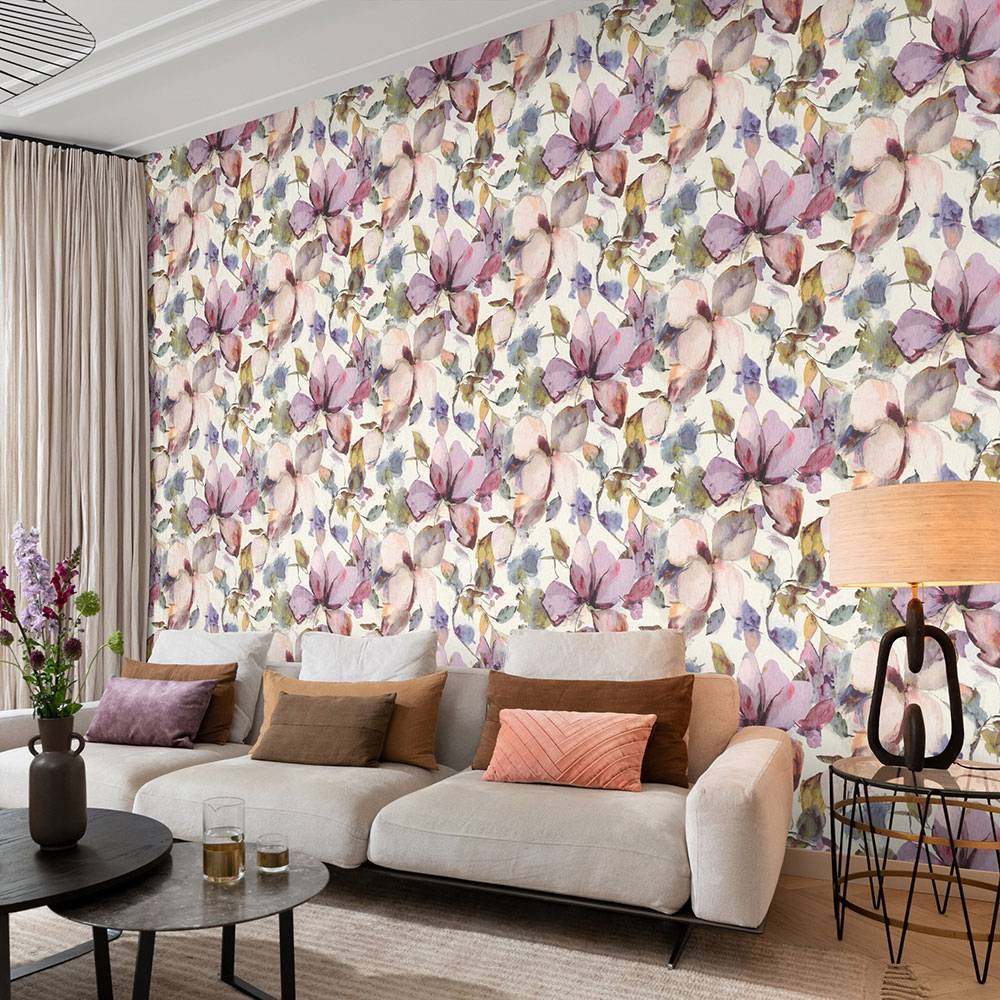 ピンクのモクレンの花言葉は「華麗」と「壮大」。織物調エンボスベースにローズ、ライラック、ピーチ、青紫色で水彩画のように繊細にモクレンが描かれていて、柔らかく、エレガントな空間が演出できます。