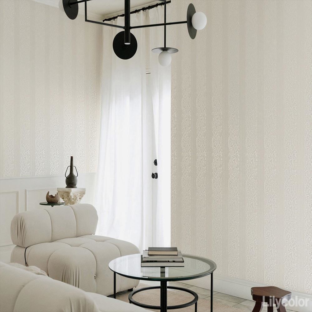 ストライプのクラシック柄。模様をパールで浮かび上がらせ、ホワイトでまとめた上品な壁紙です。