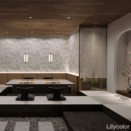 昔から神の宿る木として信じられてきた松の力強さを大胆にデザインへ落とし込みました。新芽が出ている若い松を「若松」、樹齢を重ね立派に枝葉を伸ばしたものを「老松」と呼び、壁紙に使用された型紙は老松文様であることから、深めなカラー展開との相性も抜群です。