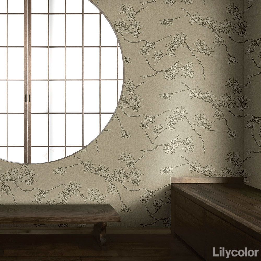 新芽が出ている若い松を「若松」、樹齢を重ね立派に枝葉を伸ばしたものを「老松」と呼び、壁紙に使用された型紙は老松文様であることから、深めなカラー展開との相性も抜群です。