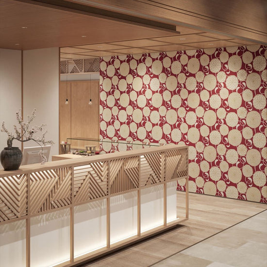力強く咲き誇る、大輪の菊が空間を彩ります。大胆な配置が生み出す迫力と、和の美が織りなす洗練された存在感が、訪れる人を魅了するデザインです。