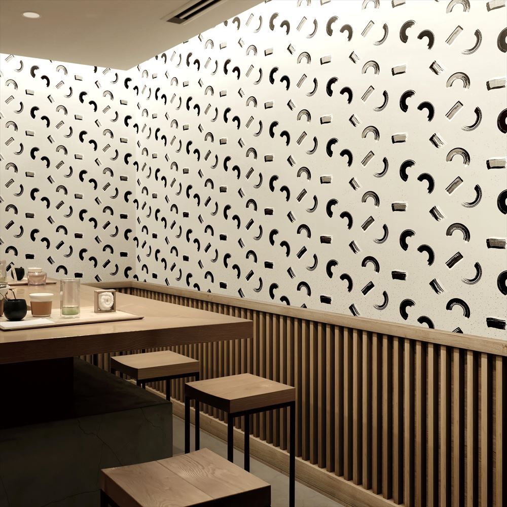 墨のかすれが生み出す、軽やかなリズム。細やかな筆のタッチとちりばめられた金箔調のパールが、和の趣を感じさせつつ、どこか遊び心のある印象に。