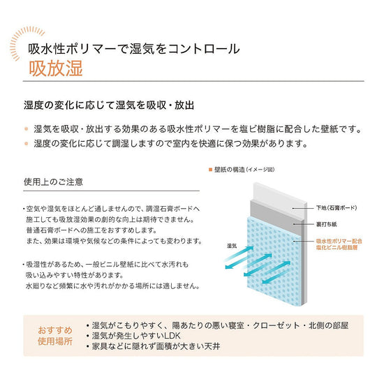 | 注意事項 | ●吸水性ポリマーが空気中や接着剤の水分を吸収し、壁紙表面にぬめりが発生する可能性がありますが、乾燥後は通常の状態に戻ります。品質や性能には問題ございません。 |