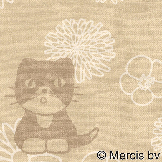ベージュの下地に、手書きの風合いのある花柄とネコをあしらったデザイン。