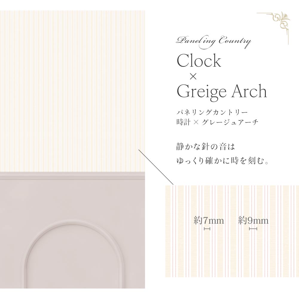 はがせる壁紙 のりなしタイプ Mon Sucrier パネリングカントリー (49cm×2.5mサイズ) NMS-CTP04 時計×グレージュアーチ ストライプ