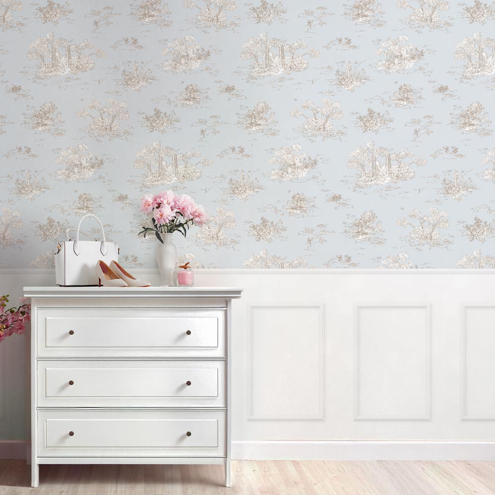 人気のトワル柄壁紙に腰壁のデザインを合わせて。