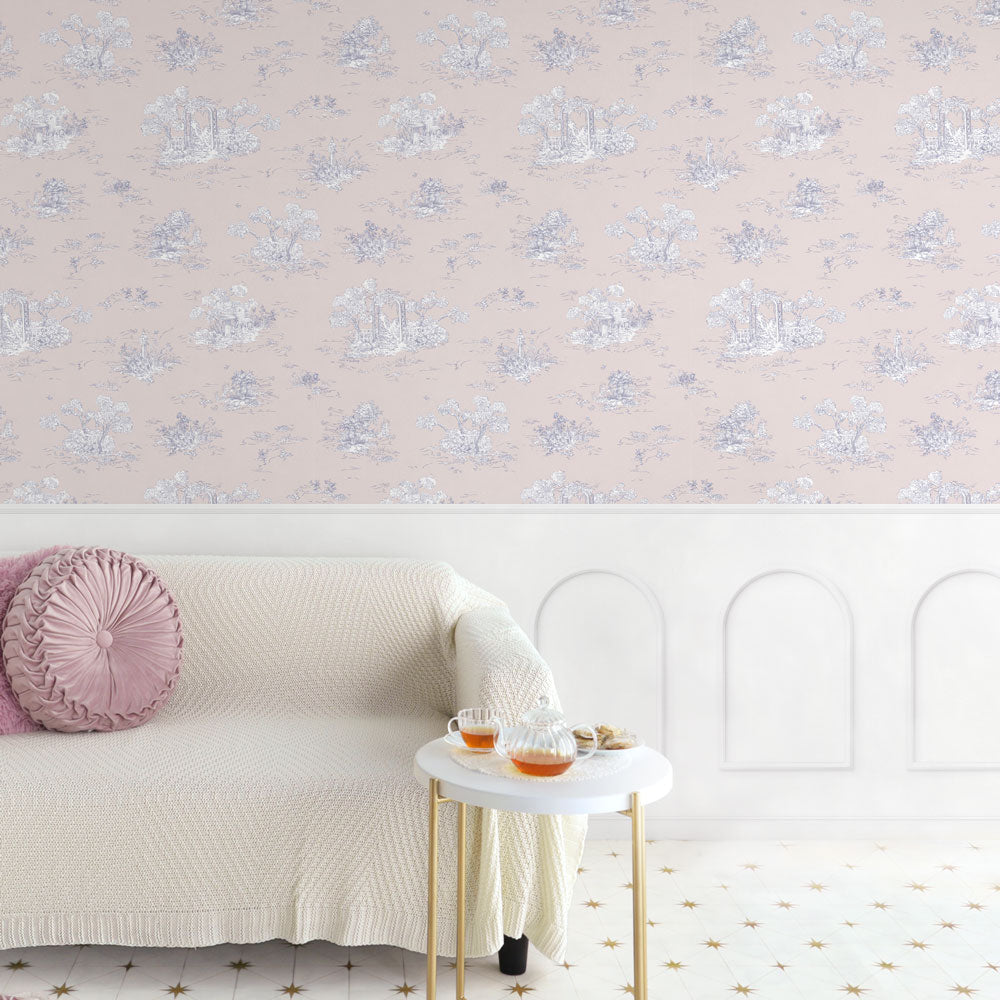 人気のトワル柄壁紙に腰壁のデザインを合わせて。