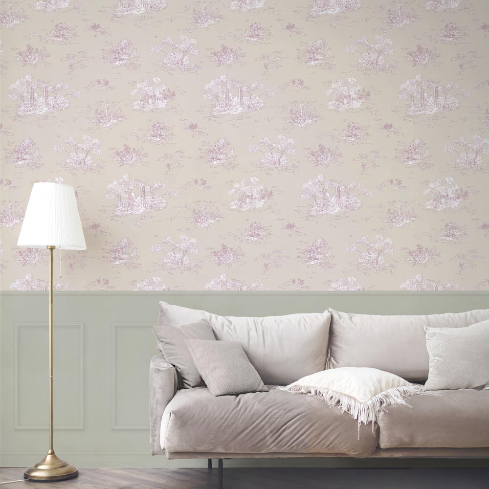 人気のトワル柄壁紙に腰壁のデザインを合わせて。