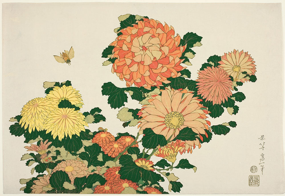 葛飾北斎 菊に虻(鮮やか)