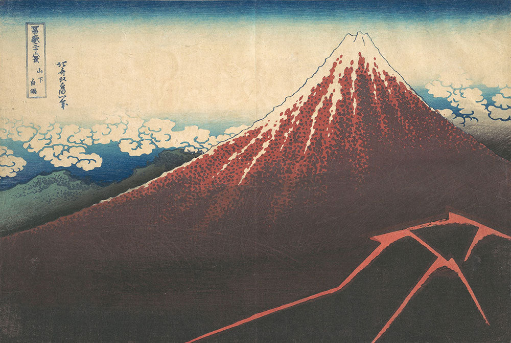 白雨とは夕立のこと。快晴の山頂に対し、山麓に下ると漆黒の闇に包まれ強烈に走る一瞬の稲妻が描かれている。「赤富士」と対称にこの作品は「黒富士」と呼ばれる。