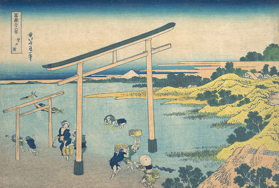 鳥居の周辺には潮干狩りを楽しむ人々が確認でき、日常のひと時を描いた作品。この浅瀬に立った鳥居は登渡神社のものとされる。