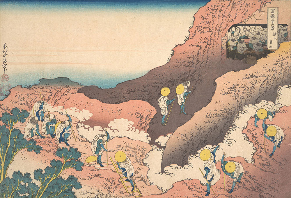 「冨嶽三十六景」の中で唯一、富士の山容が描かれていない。描かれているのは、荒々しい富士の山肌と、富士山頂を目指す富士山を信仰する人々。