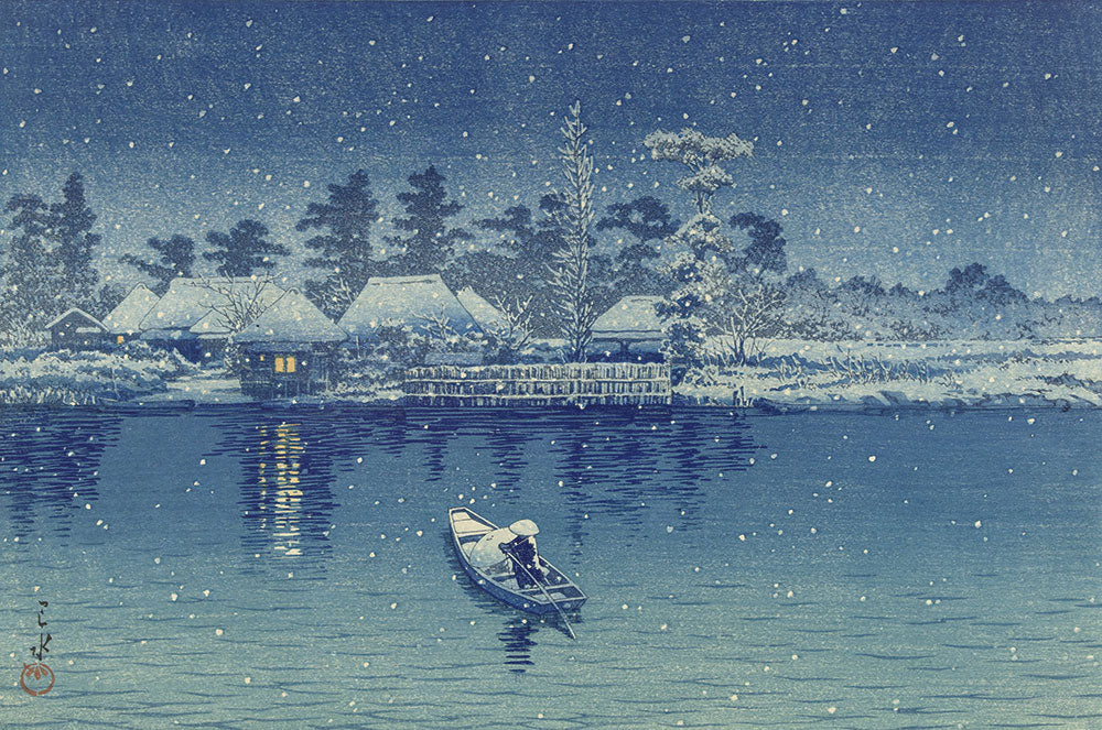 衰退した日本の浮世絵版画を復興すべく、吉田博らとともに新しい浮世絵版画である新版画を確立した川瀬巴水の木版画。