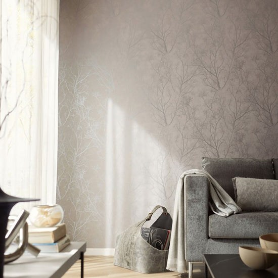 エッジの効いた木立ちのシルエットがパールで光るデザイン