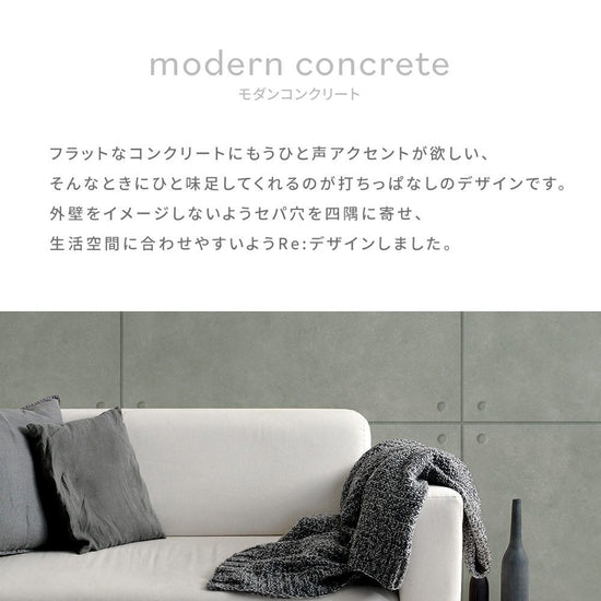 フラットなコンクリートにもうひと声アクセントが欲しい、そんなときにひと味足してくれるのが打ちっぱなしのデザインです。外壁をイメージしないようセパ穴を四隅に寄せ、生活空間に合うようRe:デザインしました。デザイナーズを彷彿とさせるミニマムでモダンな雰囲気は木材や金属、ガラスなど様々なマテリアルとの相性も良くインテリアに深みが出ます。