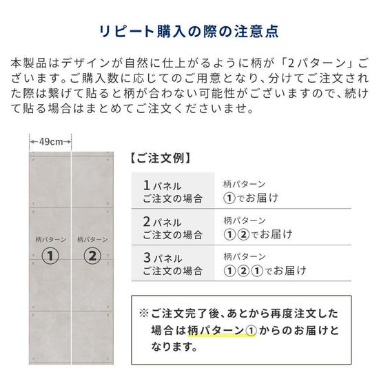 本製品はデザインが自然に仕上がるように柄が「2パターン」ございます。ご購入数に応じてのご用意となり、分けてご注文された際は繋げて貼ると柄が合わない可能性がございますので、続けて貼る場合はまとめてご注文くださいませ。