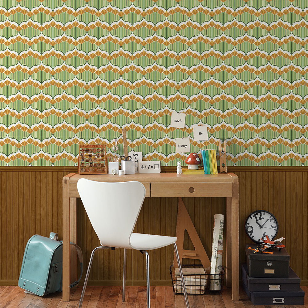 人気のReビンテージウォールペーパーシリーズとウッドパネルのデザインを組み合わせました。
