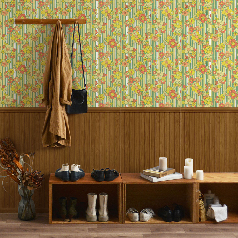 人気のReビンテージウォールペーパーシリーズとウッドパネルのデザインを組み合わせました。