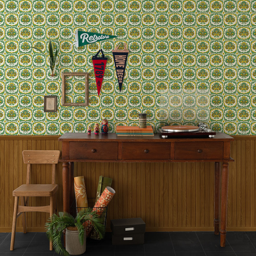 人気のReビンテージウォールペーパーシリーズとウッドパネルのデザインを組み合わせました。