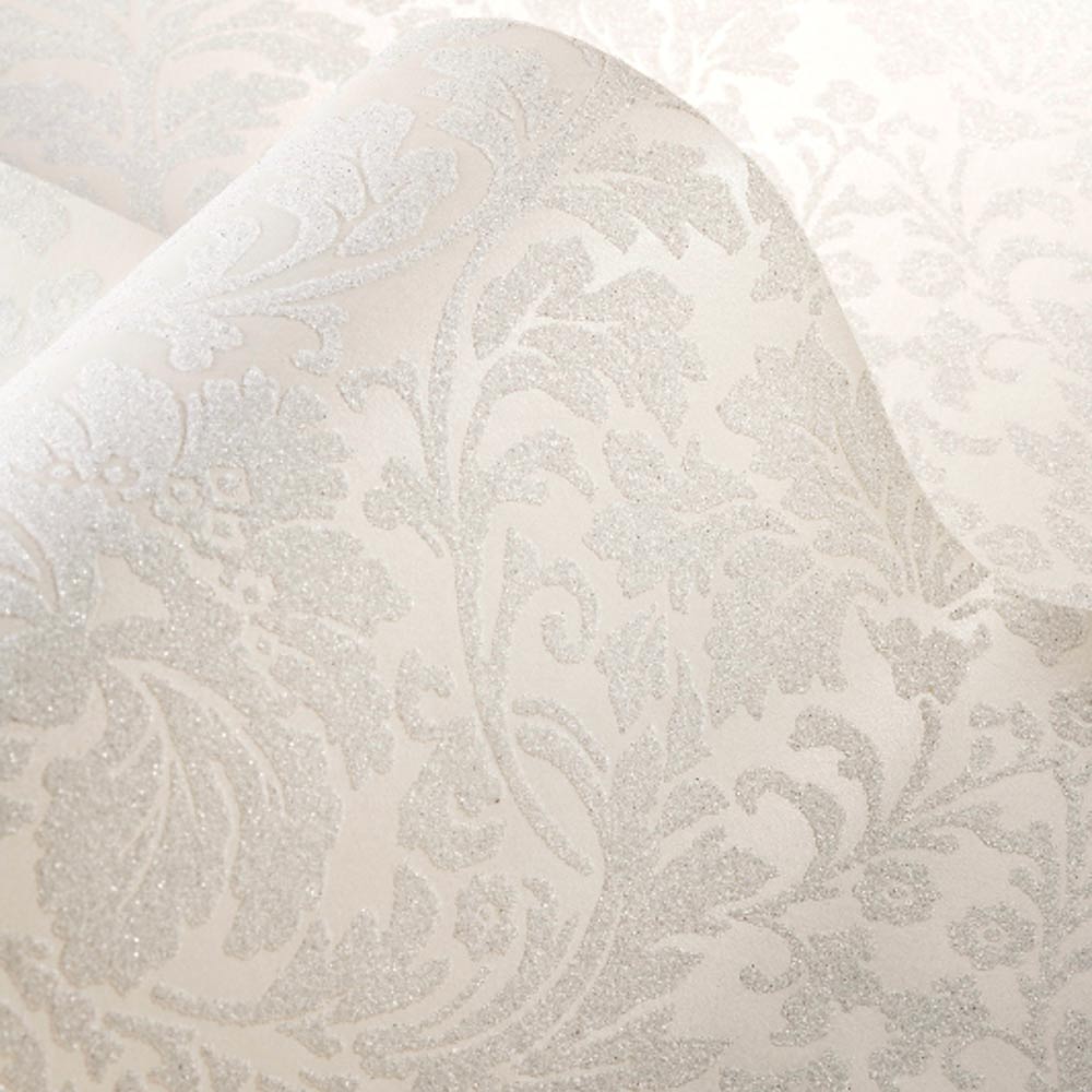 高級感あるダマスク柄にガラスビーズをあしらったラグジュアリーな壁紙です。不燃認定商品ですので、ホテルをはじめとする内装制限がある空間にも安心してお使いいただけます。