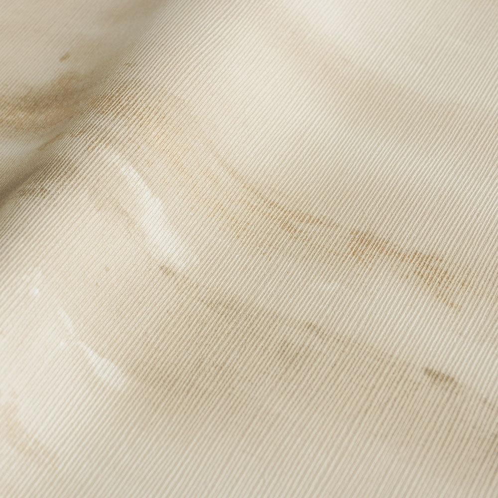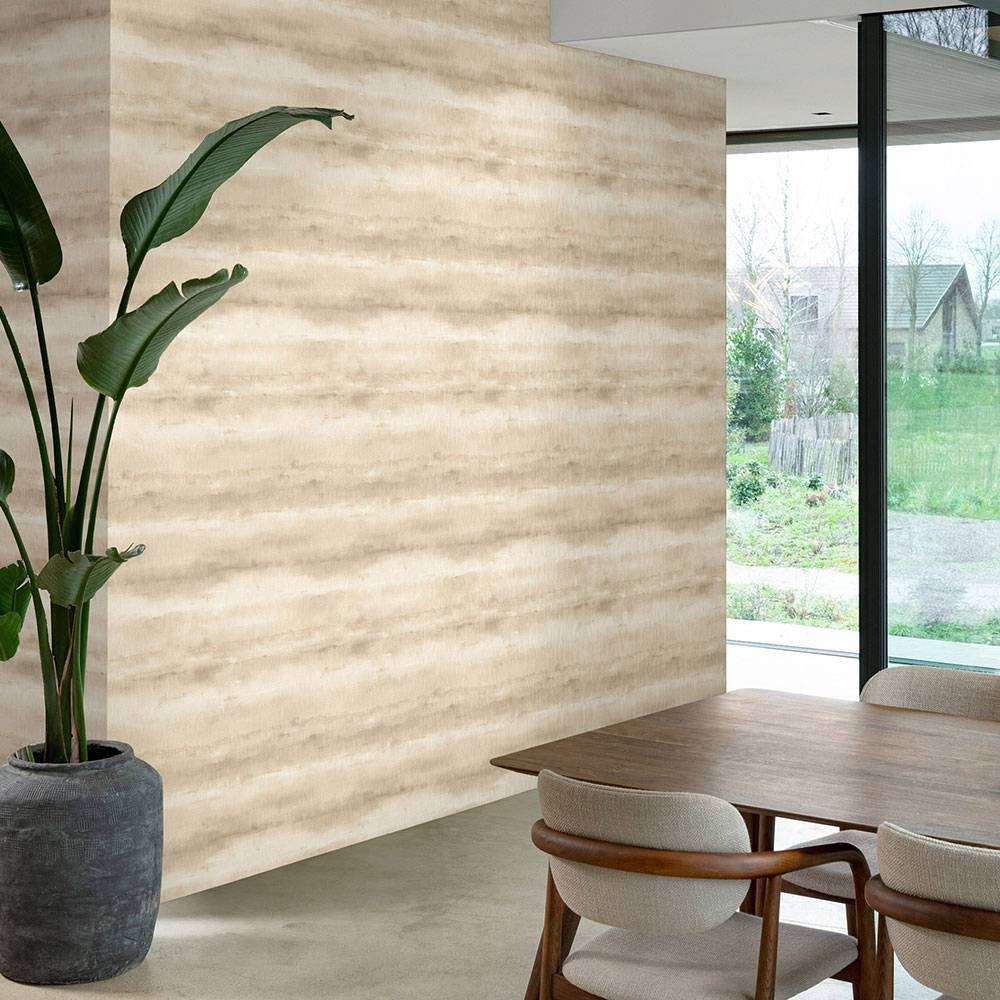 ソフトな水彩とハードなメタリックのアクセントが柔らかく融和して、地層のようなボーダー柄を描きます。横に広がるアースカラーのグラデーション効果で、実際の部屋よりも広く感じることでしょう。安らぎと温もりを感じる空間に仕上げます。