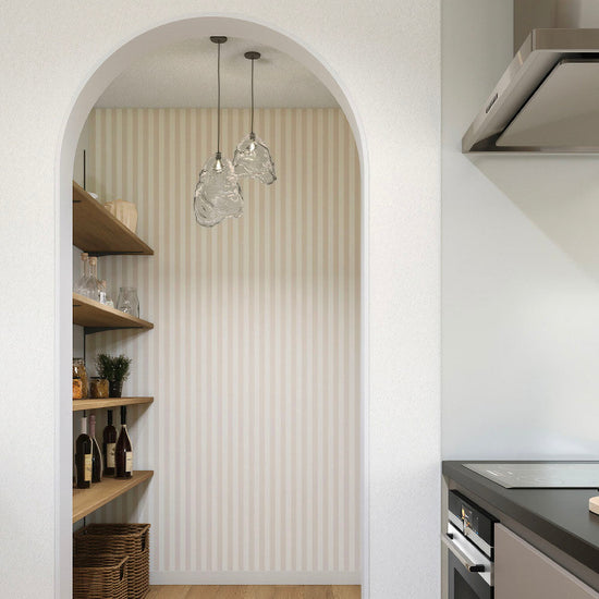 細めのストライプはクローゼット内やパントリー、ニッチなど、狭い空間でも貼り映えします。人気のグレージュカラーです。